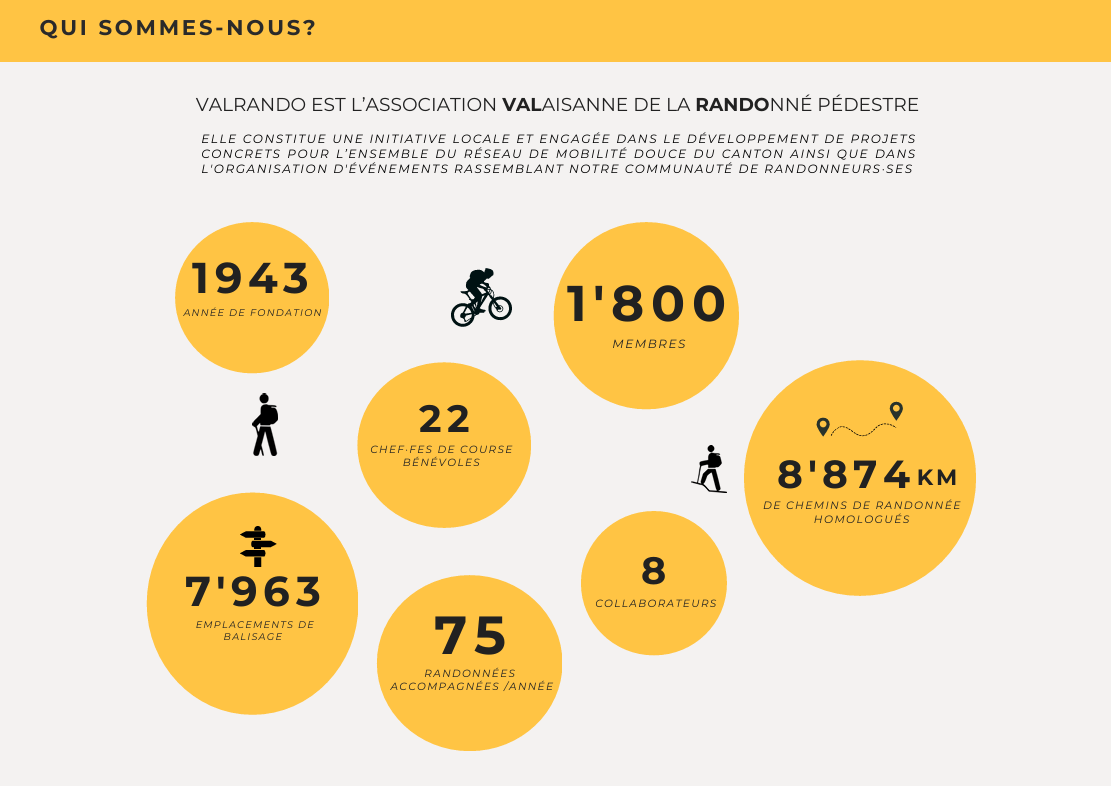 2018 Valrando a 75 ans. Elle emploie six collaborateurs (510%) qui effectuent, d'une part une activité de conseil et de soutien aux collectivités; d'autre part, qui assurent les activités de terrain pour les presque 2’000 membres de l’association, soit: 60 randonnées d'une journée ainsi que 10 séjours guidés par an.