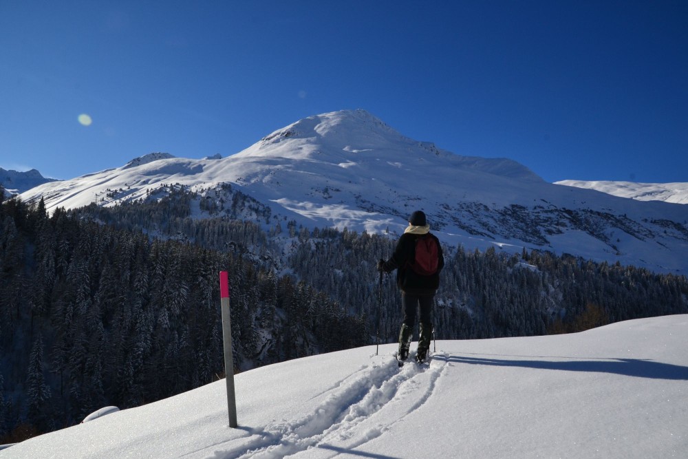 Le haut plateau bordé de mélèzes enneigés et de lacs gelés qui entoure le col du Simplon est idéal pour des randonnées en raquettes. Depuis la route du col, l’itinéraire traverse le haut plateau formé par les glaciers, passe devant des alpages éparpillés, toujours accompagné d’un impressionnant panorama sur les sommets.