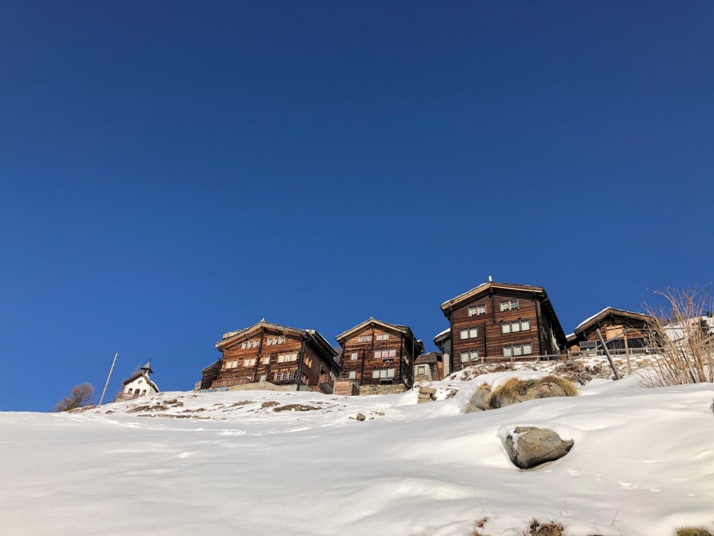 Le point de départ de cette randonnée en raquettes se situe à Blatten près de Naters, un village de montagne idyllique avec ses maisons en bois noircies par le soleil et ses mazots, typiques du Valais. Après Blatten, le sentier court en zigzag le long du torrent du Bruchi, le traverse, puis mène jusqu’au hameau d’Egga. La vue sur la vallée est déjà superbe à ce stade. Une immense moraine latérale a été déposée ici même par le grand glacier d’Aletsch. Un lac glaciaire a ensuite vu le jour, mais aujourd’hui ce n’est plus qu’un marais avec un petit village – Egga – niché sur l’ancienne rive. Autre curiosité, les pignons des habitations, qui s’adaptent à la déclivité de la pente.