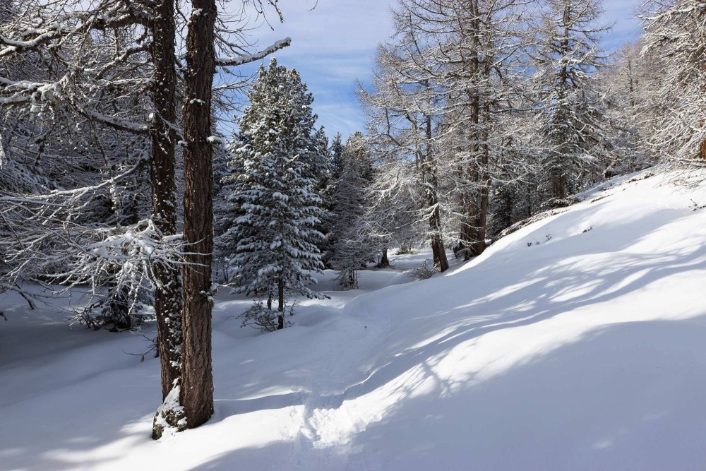 Seuls au cœur du paysage hivernal : c’est l’expérience qui nous attend lors de cette randonnée en raquettes dans la région de Moosalp.