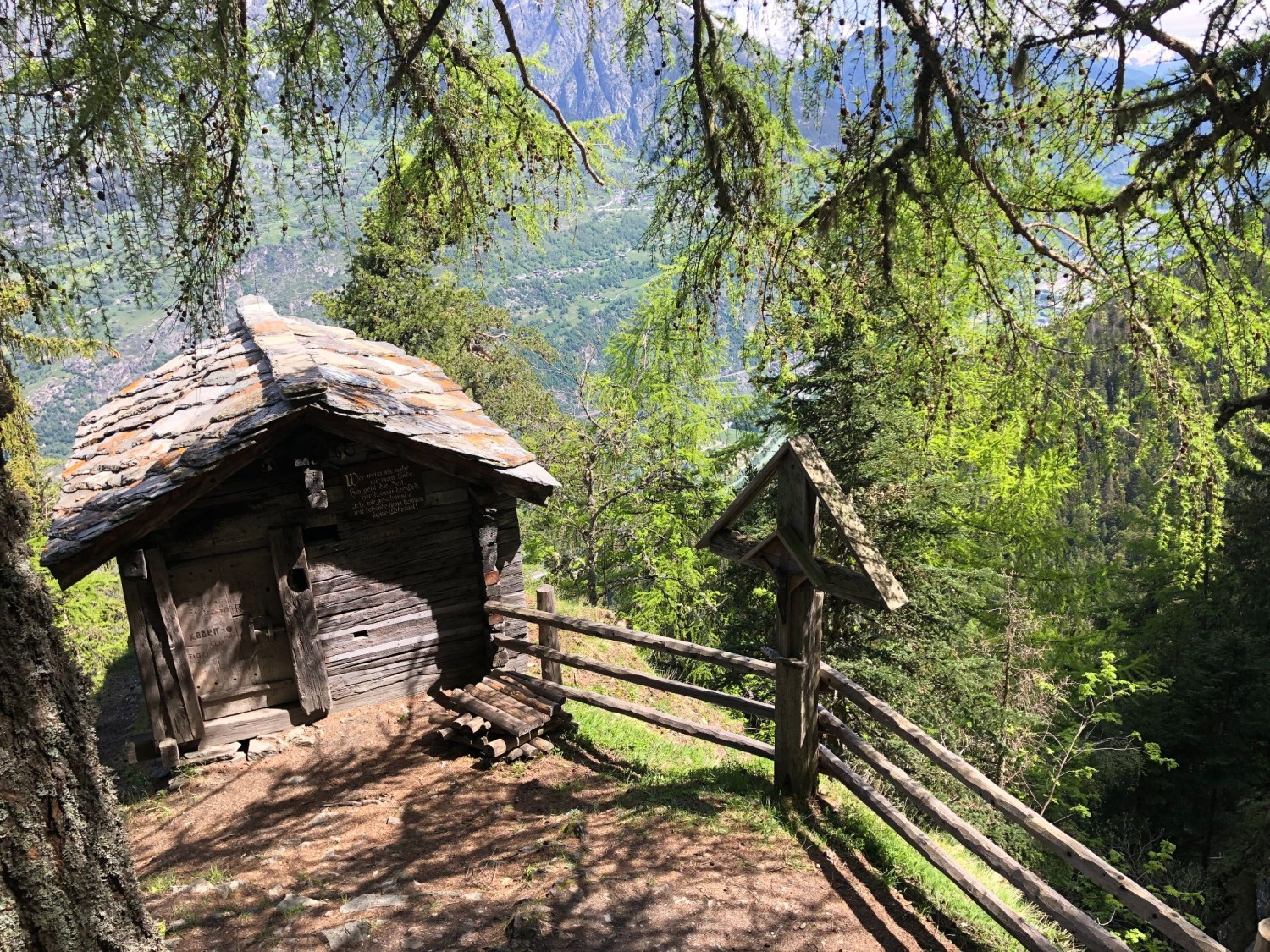 Le sentier de randonnée traverse de magnifiques forêts de mélèzes et de sapins jusqu’au point de vue du Hüoterhüsi, d’où l’on admire la vallée du Rhône.